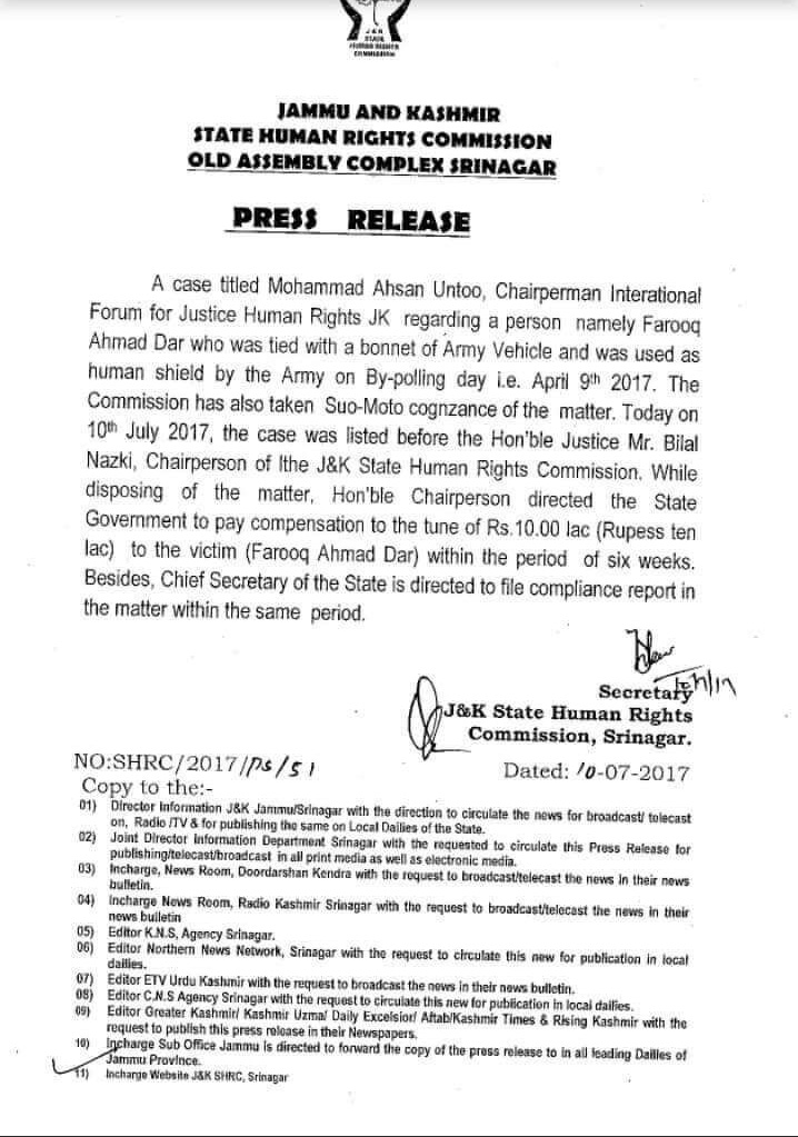 Jammu & Kashmir: The State Human Rights Commission (SHRC) Chairman Justice Bilal Nazki on Monday, 10th July 2017, directed the Jammu and Kashmir Government to provide Rs.10 lakh as compensation to the civilian allegedly used as a human shield by the army earlier this year.